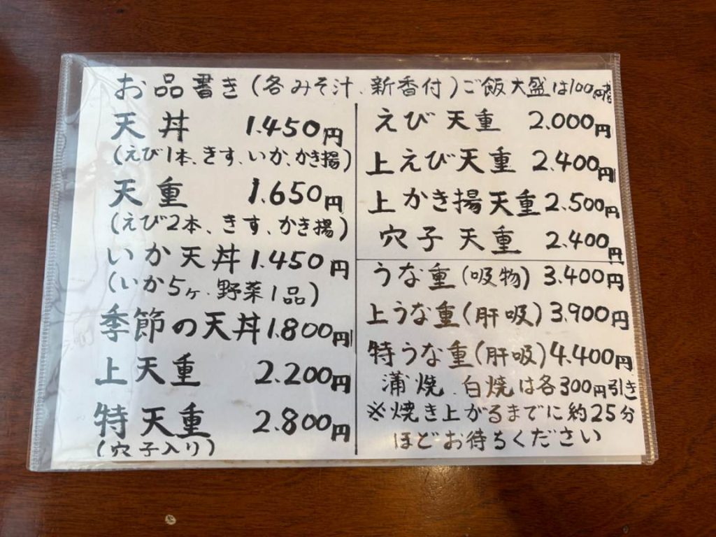 メニューは天丼・天重を中心とした構成ですが、それだけにとどまらず、うな重や季節限定の天ぷら、ふぐ料理なども用意されています。