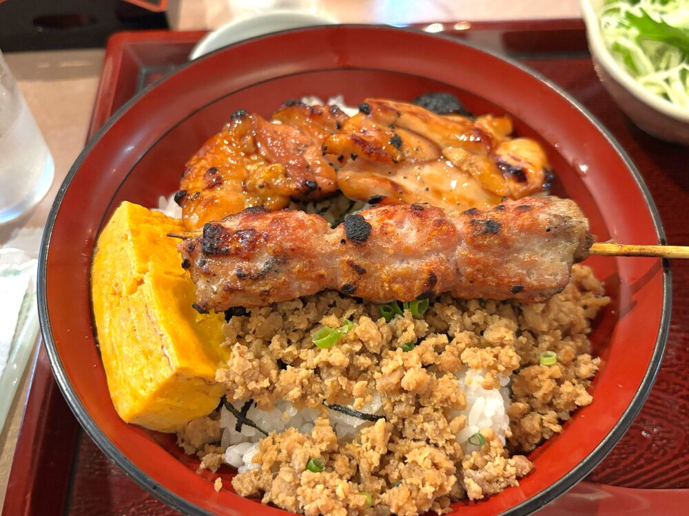 焼鳥串、そぼろ、玉子焼きが一度に乗った贅沢仕様の丼で、こちらも人気とのこと。