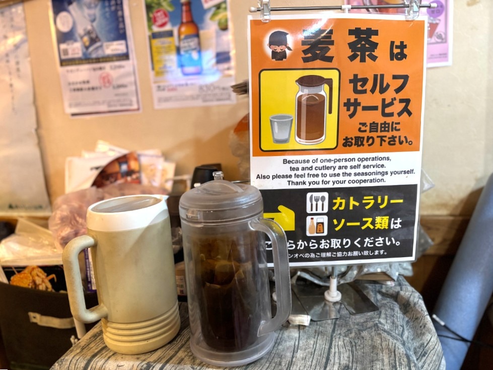 麦茶やカトラリーはセルフサービスですが、使い方や場所は店主さんが丁寧に教えてくれます。ちょっとしたやり取りも温かく、店内のアットホームな雰囲気をより感じられるポイントです。