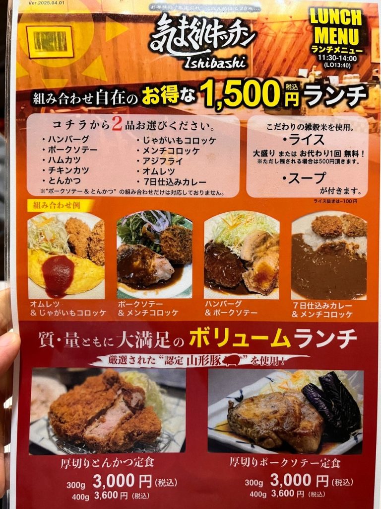 これとは別で「ボリュームランチ」もあり、厚切りとんかつ定食、厚ぎりポークソテー定食も注文が可能です。