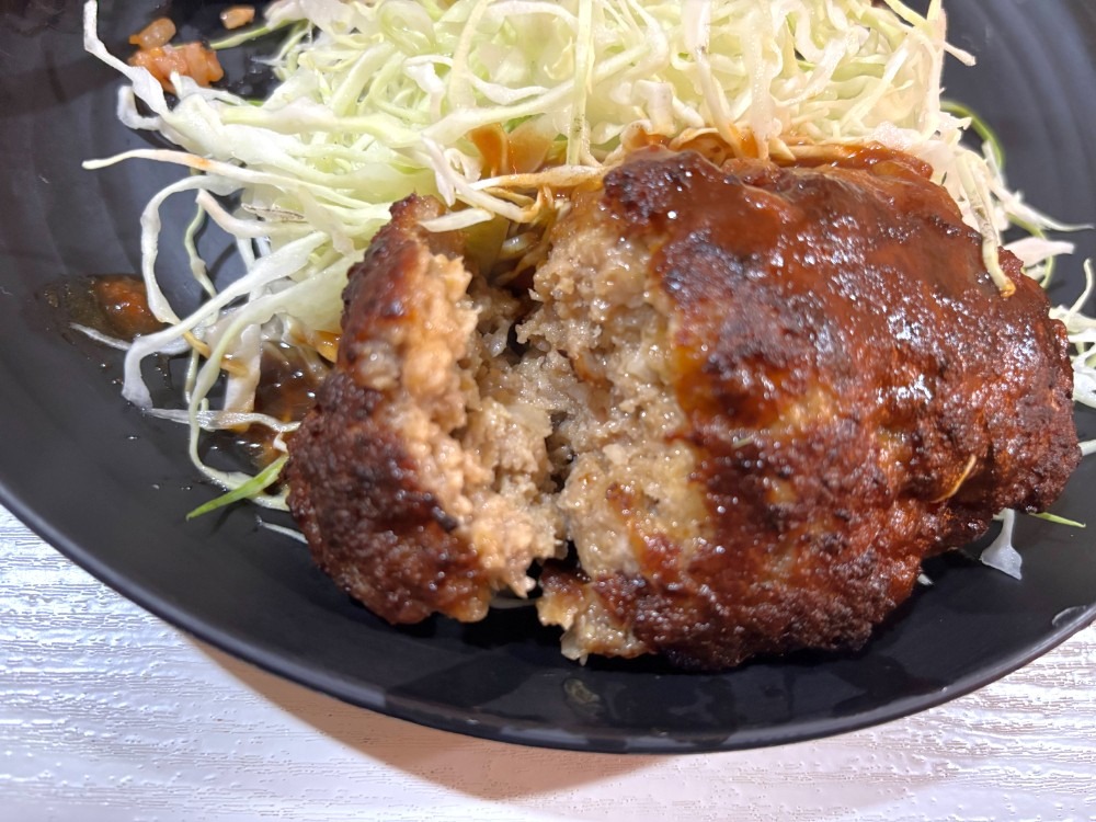 一口かじると、サクサクの衣の中から肉汁がじゅわっとあふれ、噛むたびにひき肉と玉ねぎの旨味が口いっぱいに広がります。味付けがちょうどよく、サイズに反して最後まで飽きずに食べられました!キャベツの千切りも箸休めにぴったりでした!